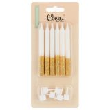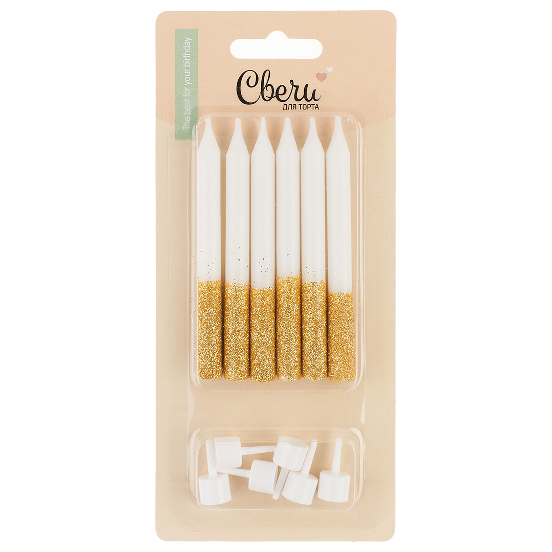 Свечи Сверкающий глиттер, Белый/Золото, с блестками, 0,77*8 + 1 см, 6 шт